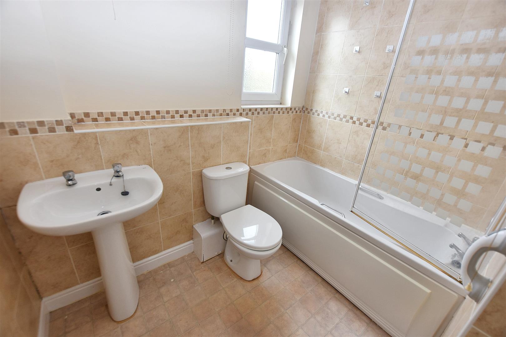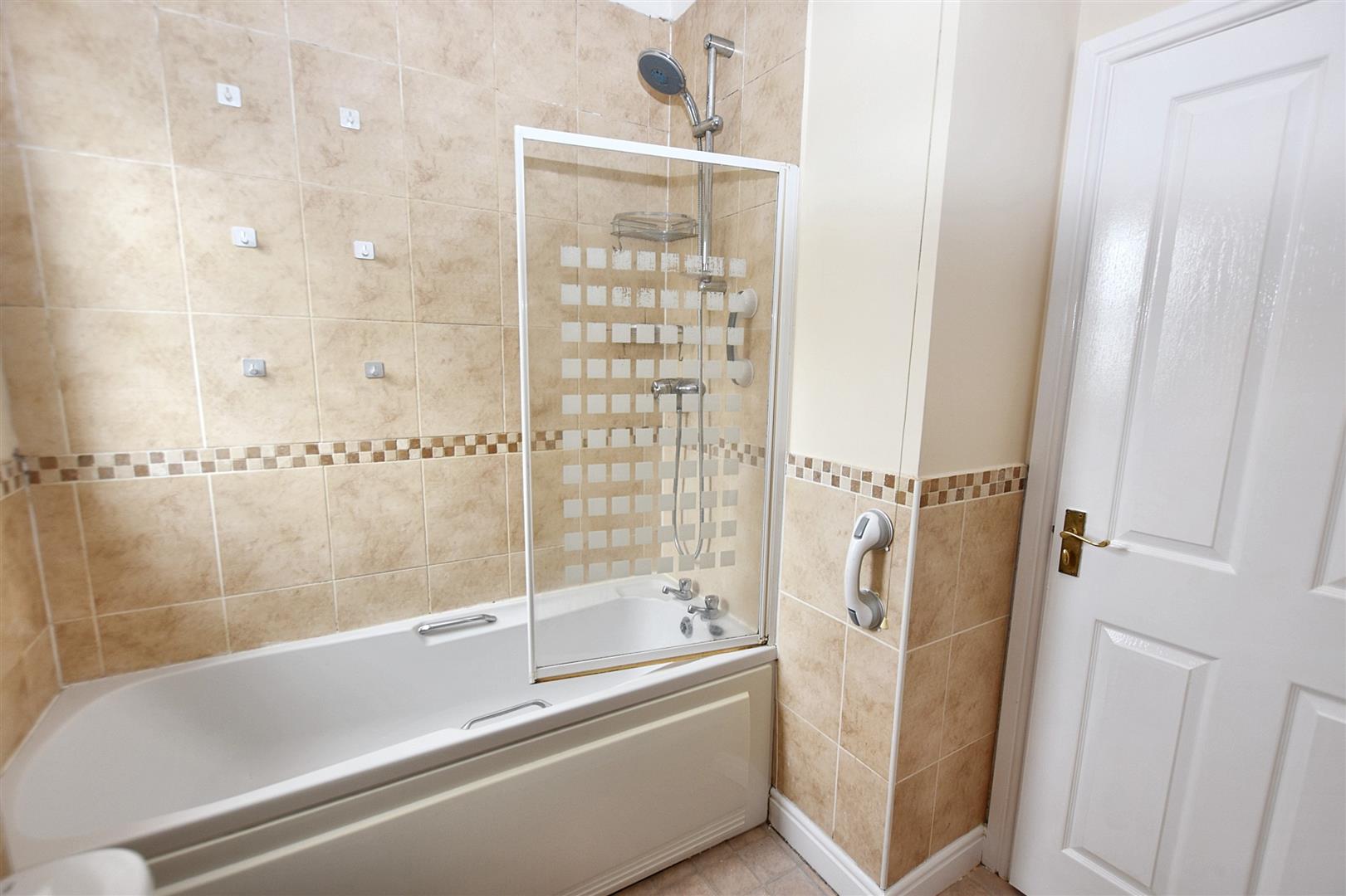 Partially tiled with a low level wc, wash hand basin with a tiled splash back and a bath with a thermostatic shower over and a glass shower screen. Obscure double glazed window to the front aspect. Extractor fan, a wall mounted pull cord light with a shaver point. Radiator.