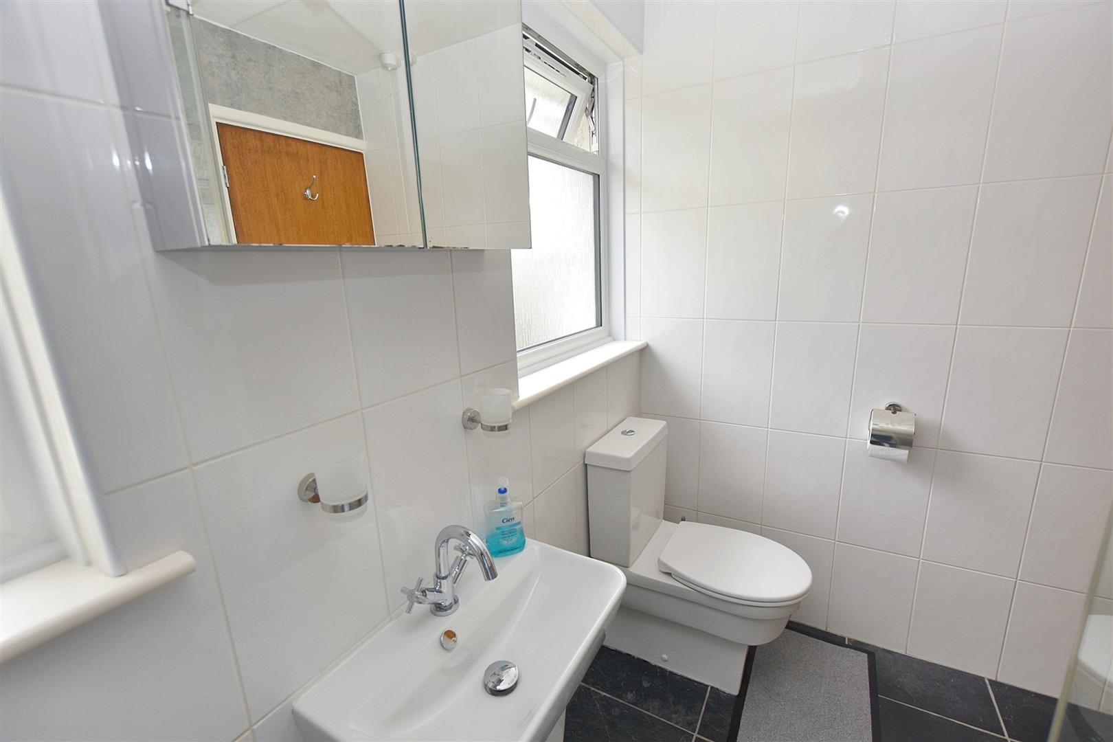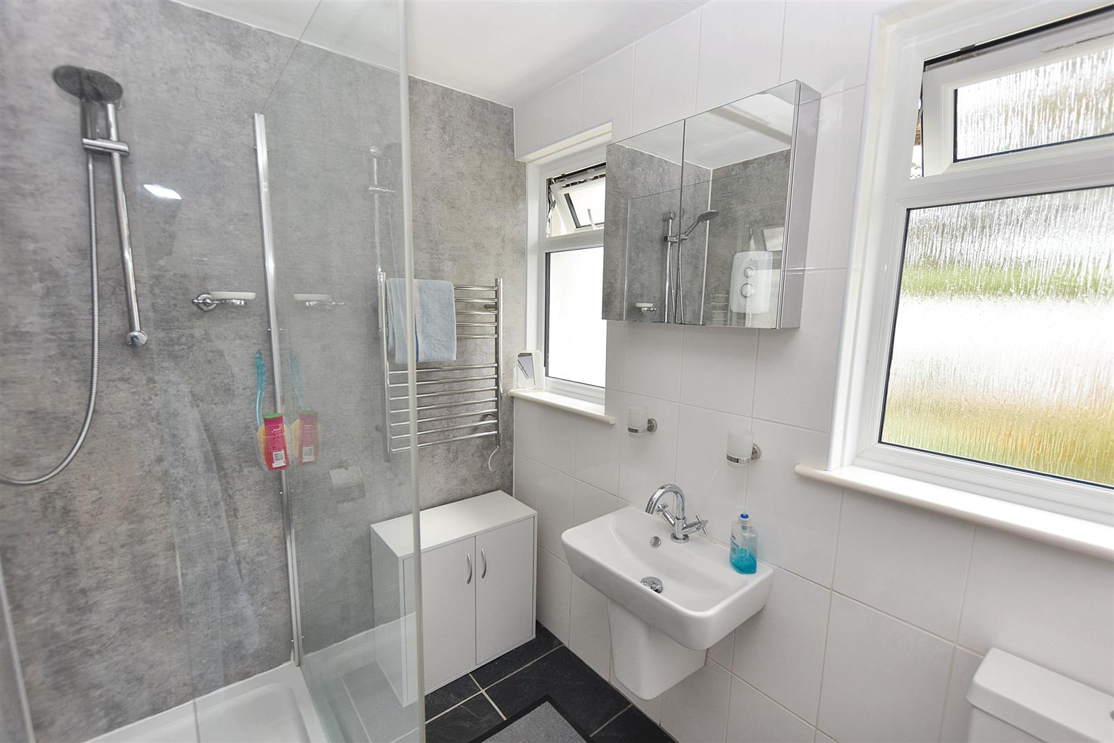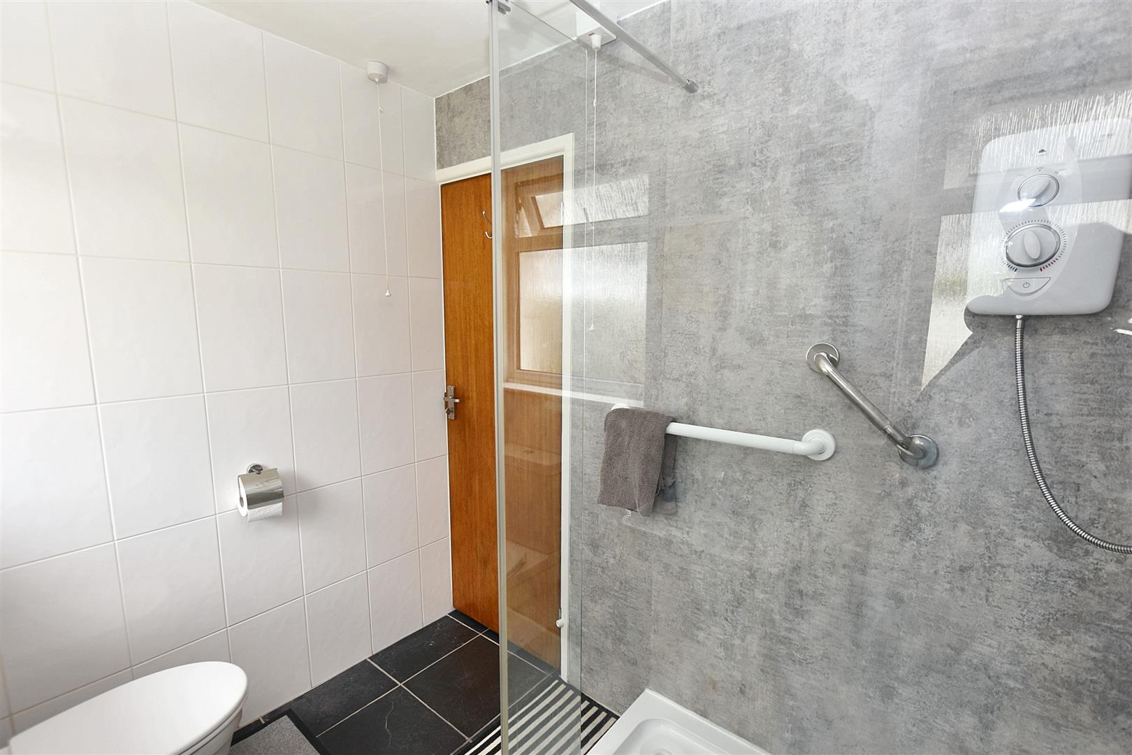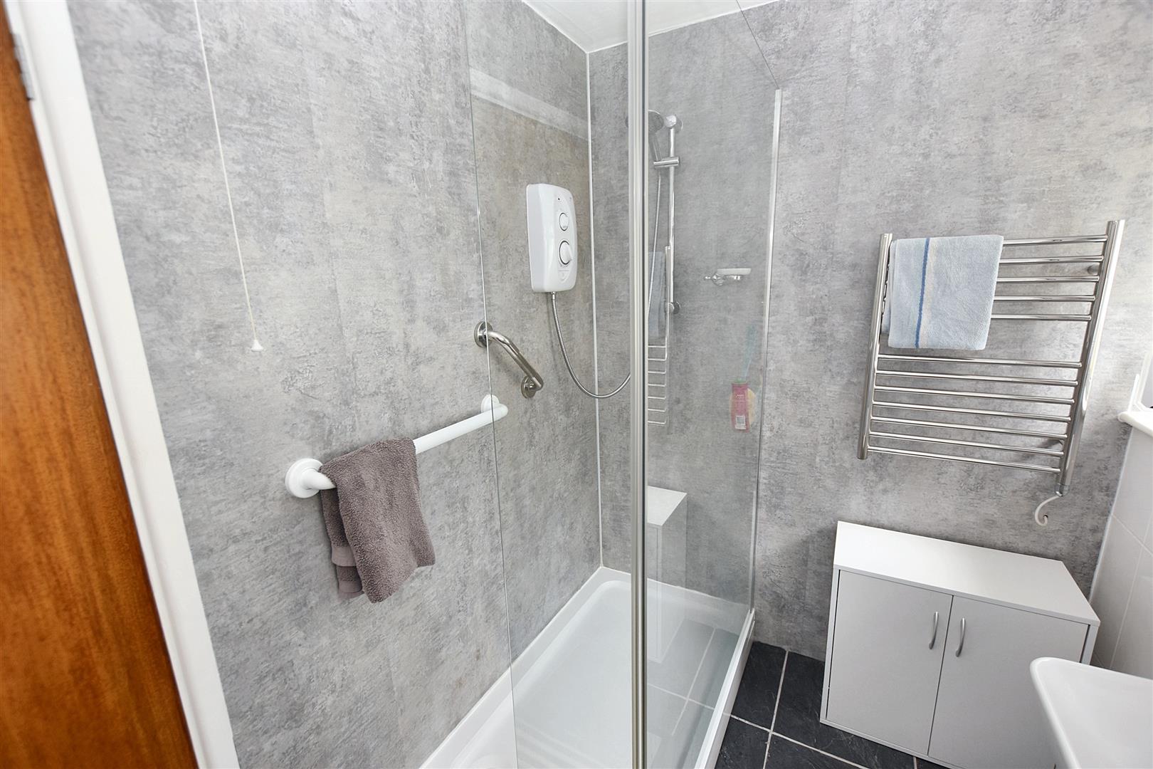 SHOWER ROOMModern walk-in shower having a Mira electric shower, wash hand basin and wc. Respatex walling in the shower area and some further wall tiling. Mirrored bathroom cabinet, extractor fan and a heated towel rail. Two windows.