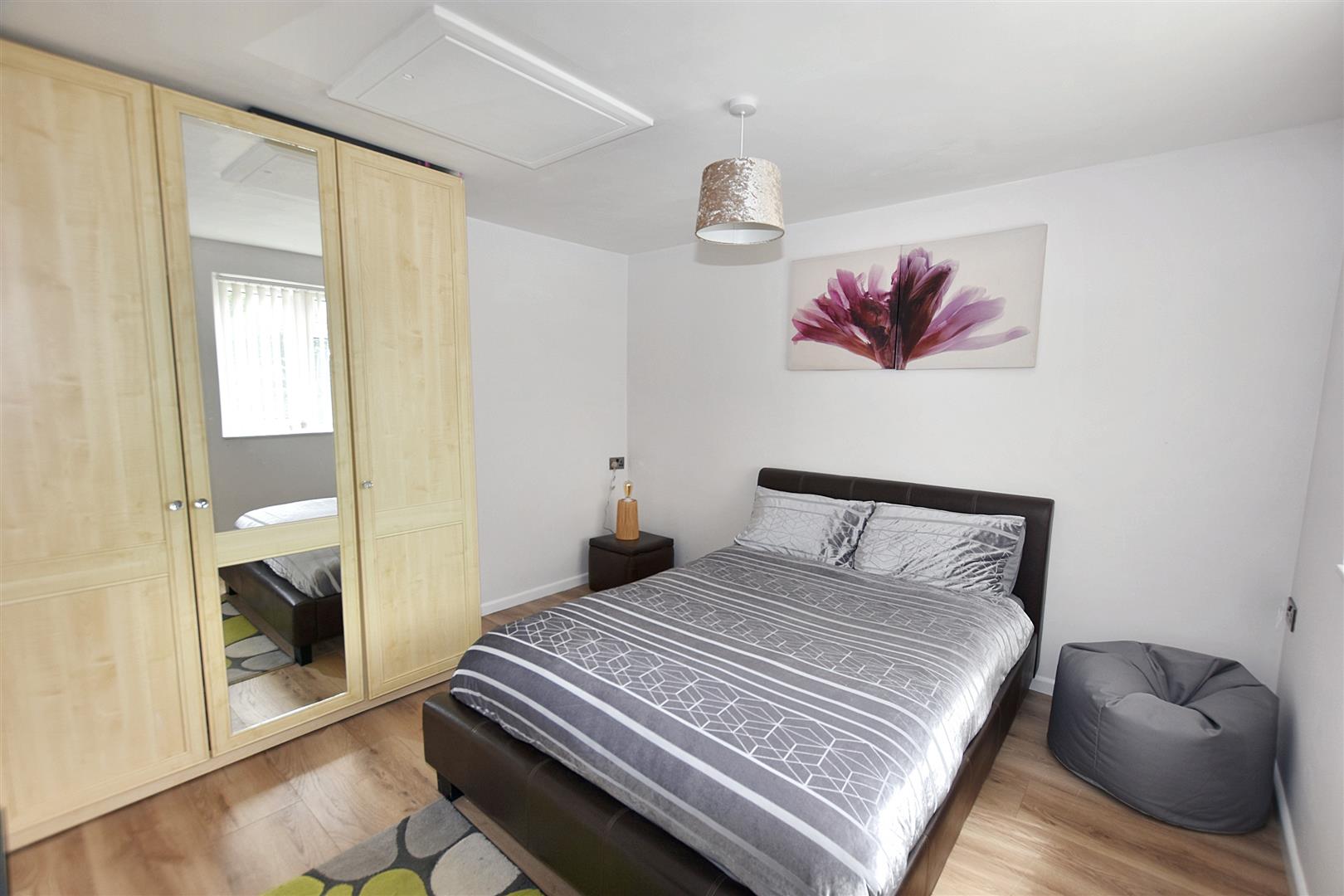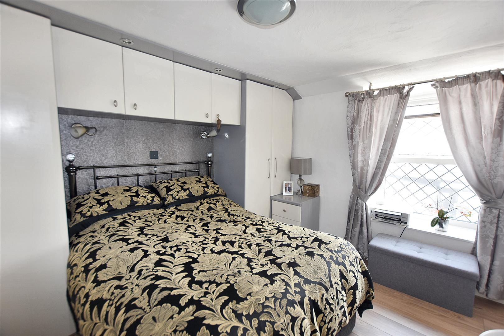 Built-in over bed wardrobes, upvc double glazed square leaded window with a deep wooden sill overlooking the front garden and aspect. Radiator and a wash hand basin with a tiled splash back.