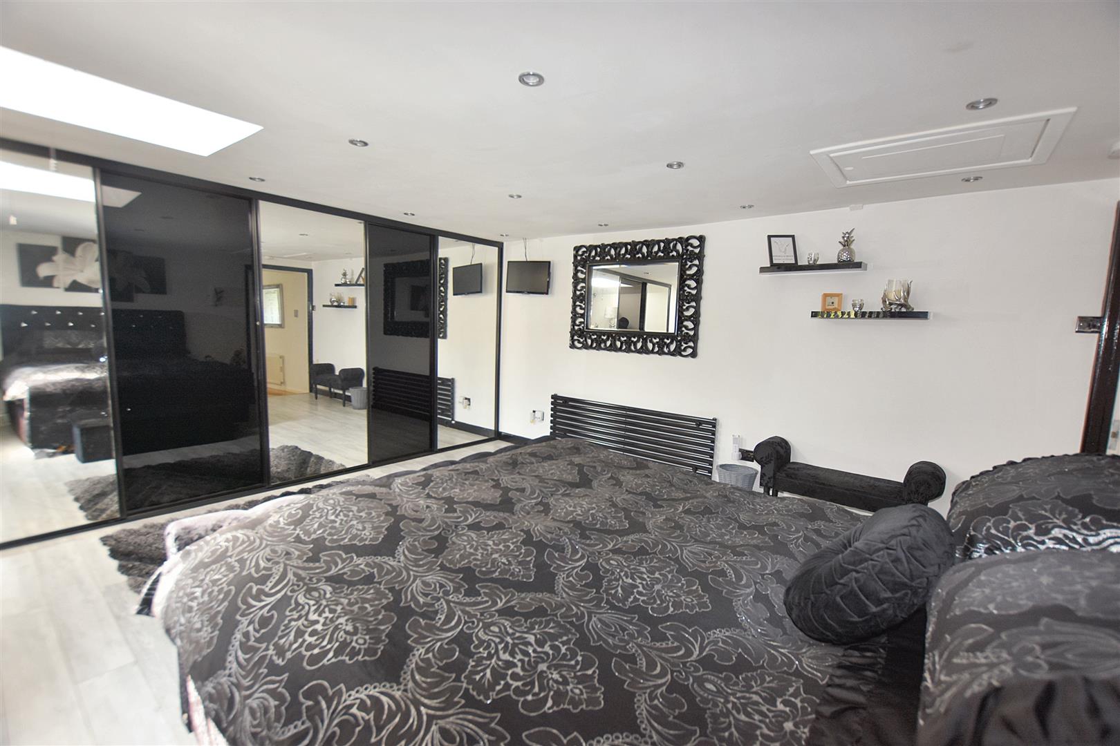 Full width built-in wardrobes, further loft access hatch, Velux skylight and a upvc double glazed square leaded window overlooking the front garden and aspect with a deep sill. Wall mounted designer radiator and spot lights.