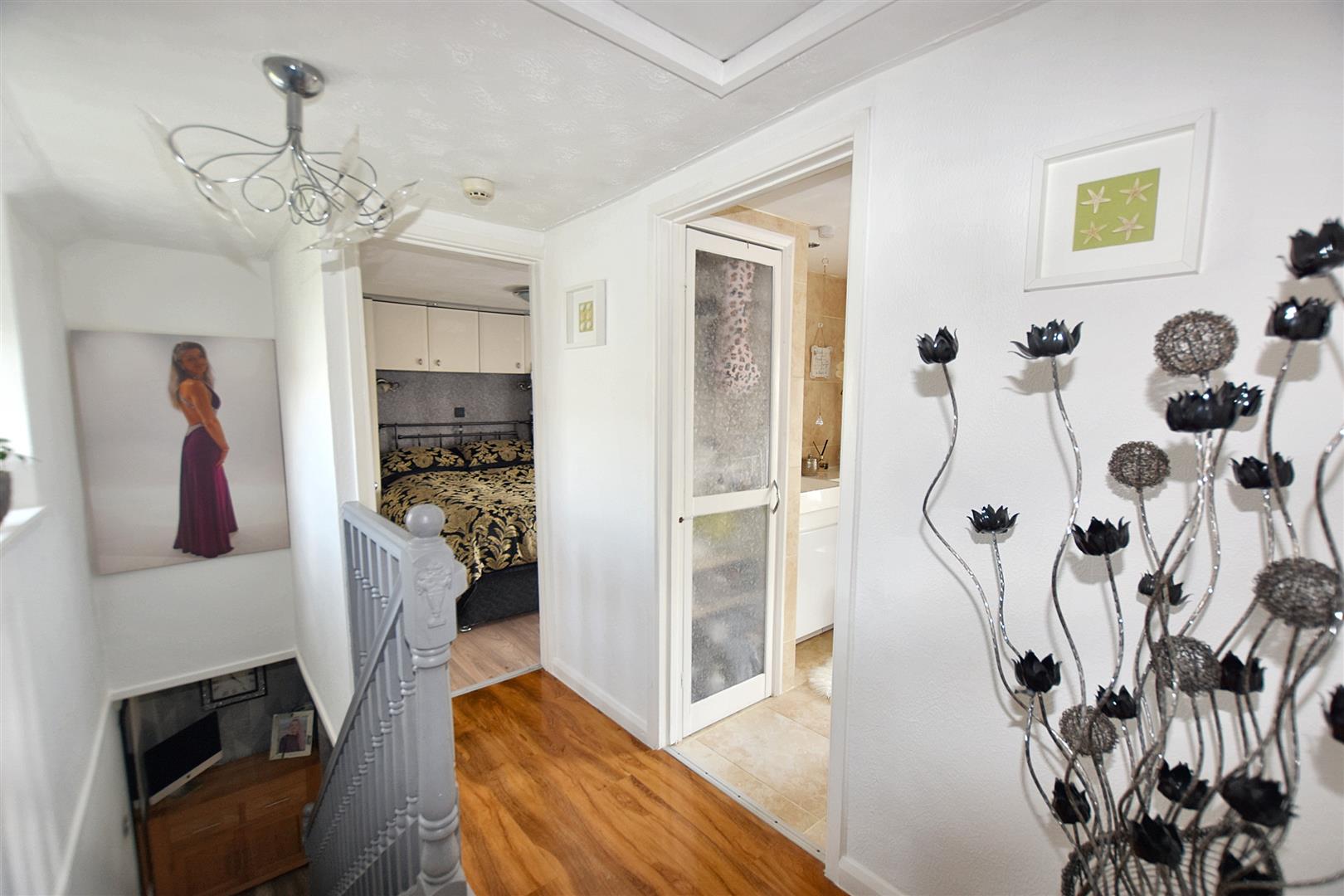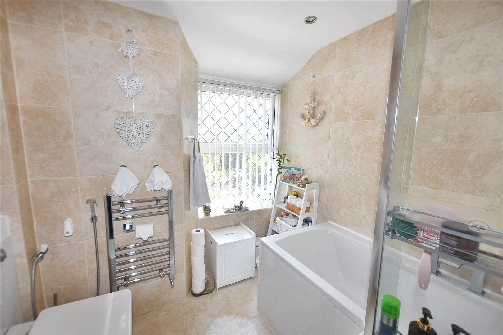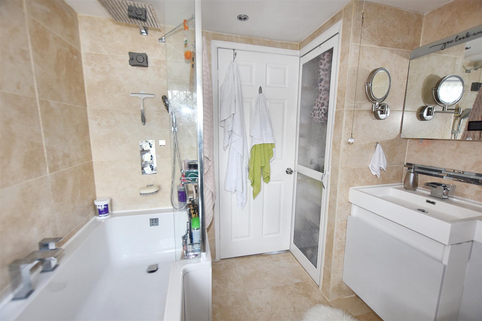 Fully tiled with a low level wc and wash hand basin in a built-in vanity unit. P shaped bath with thermostatic shower over and an L shaped shower screen. Extractor fan, wall mounted towel radiator and an obscure double glazed upvc square leaded window overlooking the front garden and aspect. Built-in storage cupboard with obscure glazed panels housing a Worcester boiler and slatted shelving space.