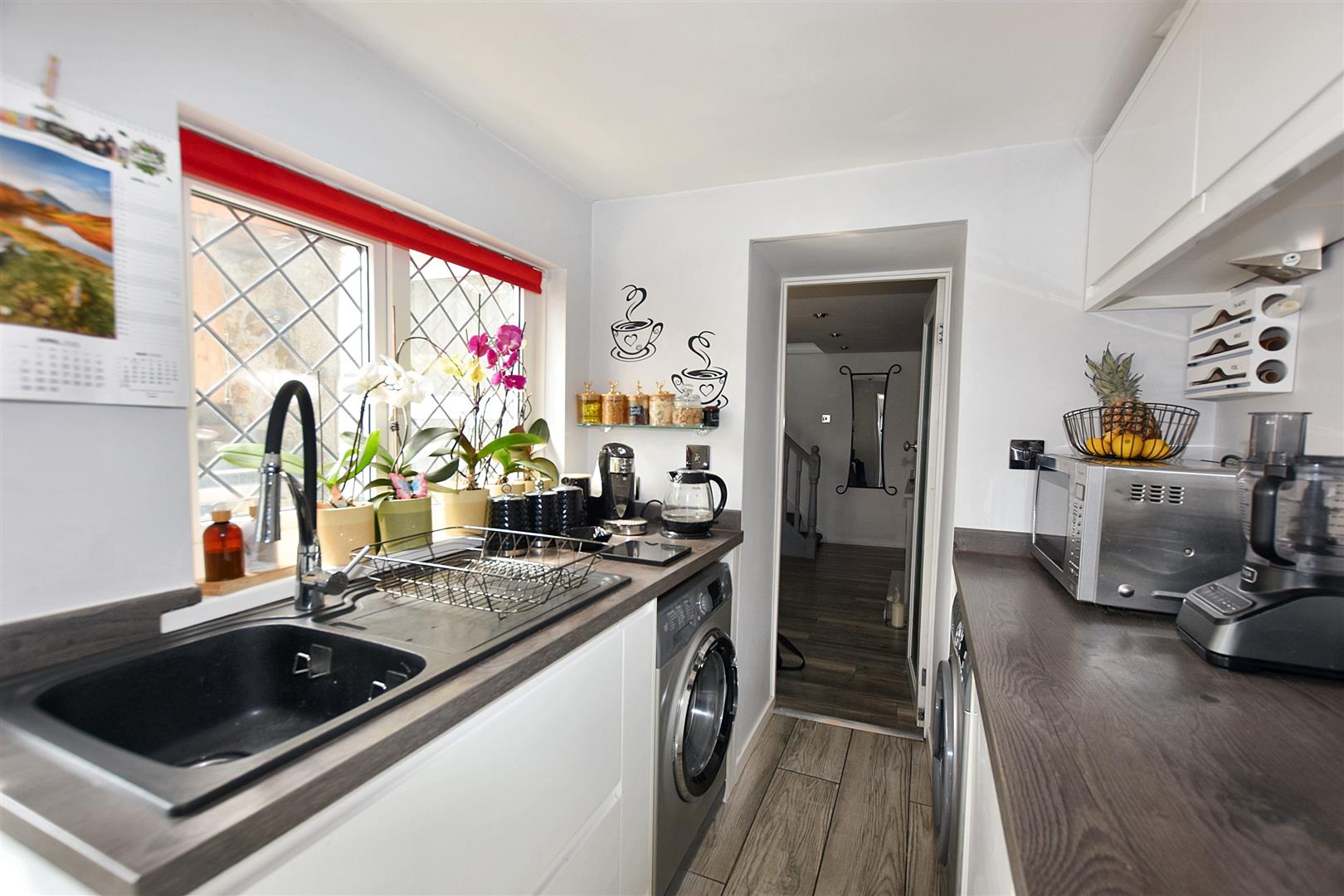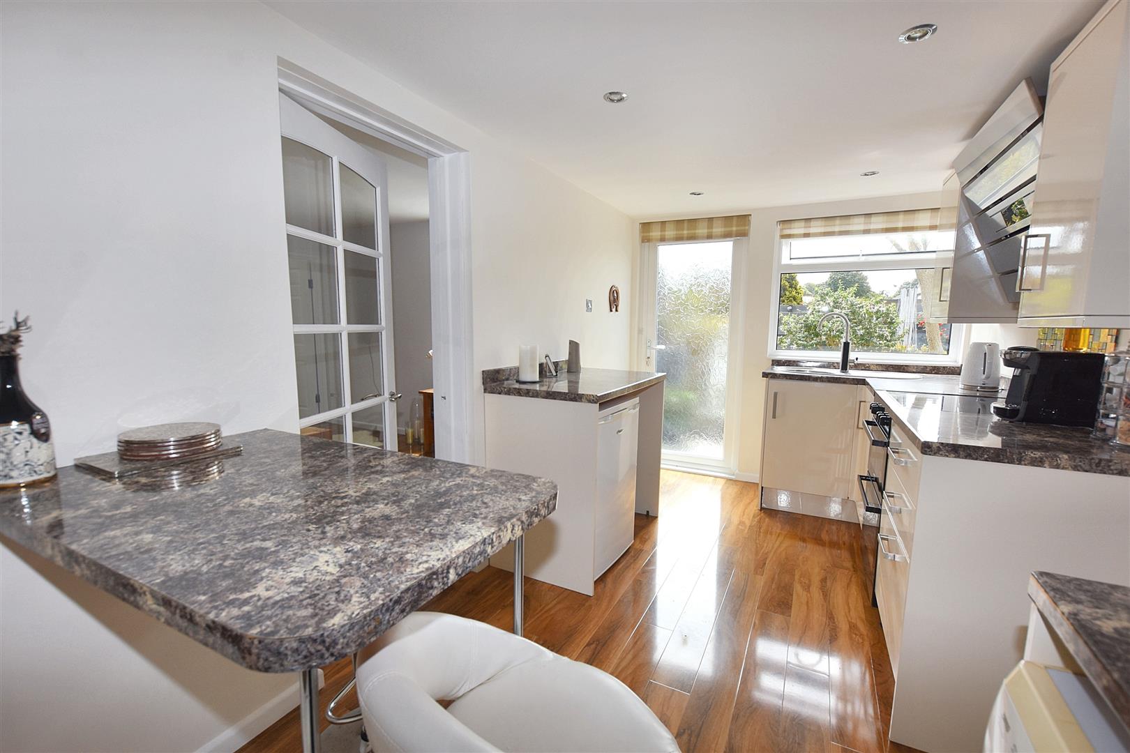 A light and airy galley style kitchen fitted with a range of eye level and base level storage cupboards and drawers with built-in handles. Square edge work surfaces, integrated fridge, space and plumbing for washing machine. Single composite sink and drainer with a upvc double glazed square leaded window overlooking the patio/bbq area. Upvc door with two double obscure glazed panels leading out to the patio area. Wall mounted electric heater, space for a free standing electric cooker with a decorative splash back with extractor above.