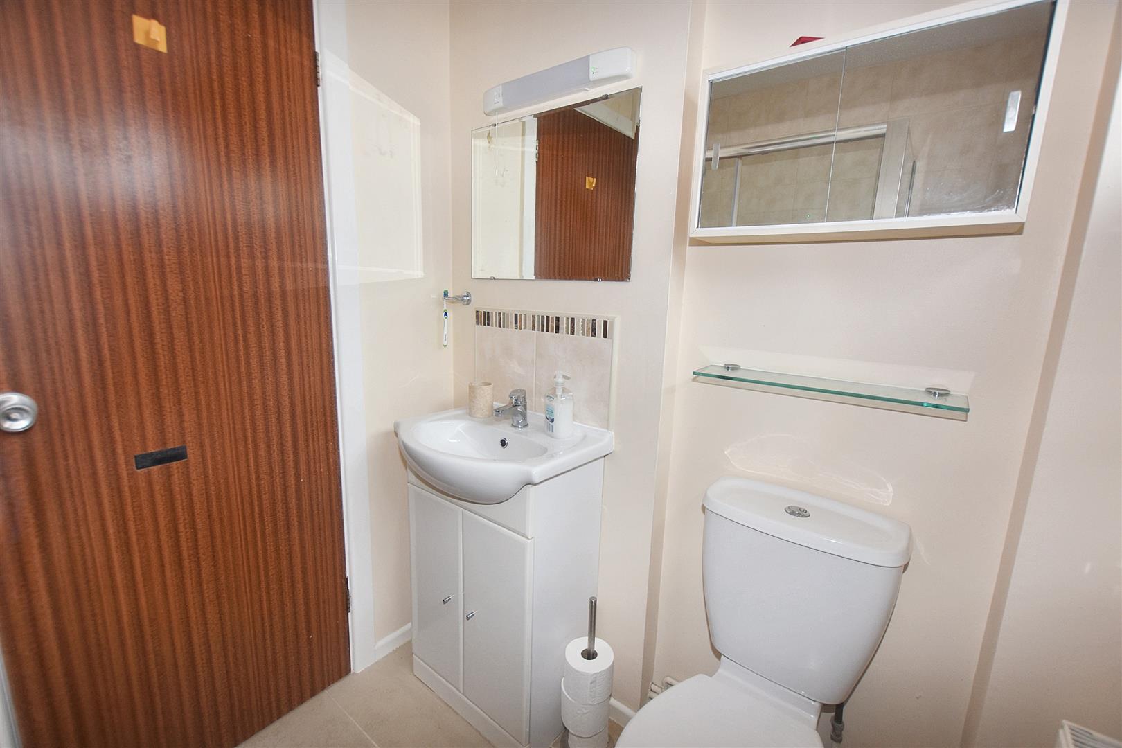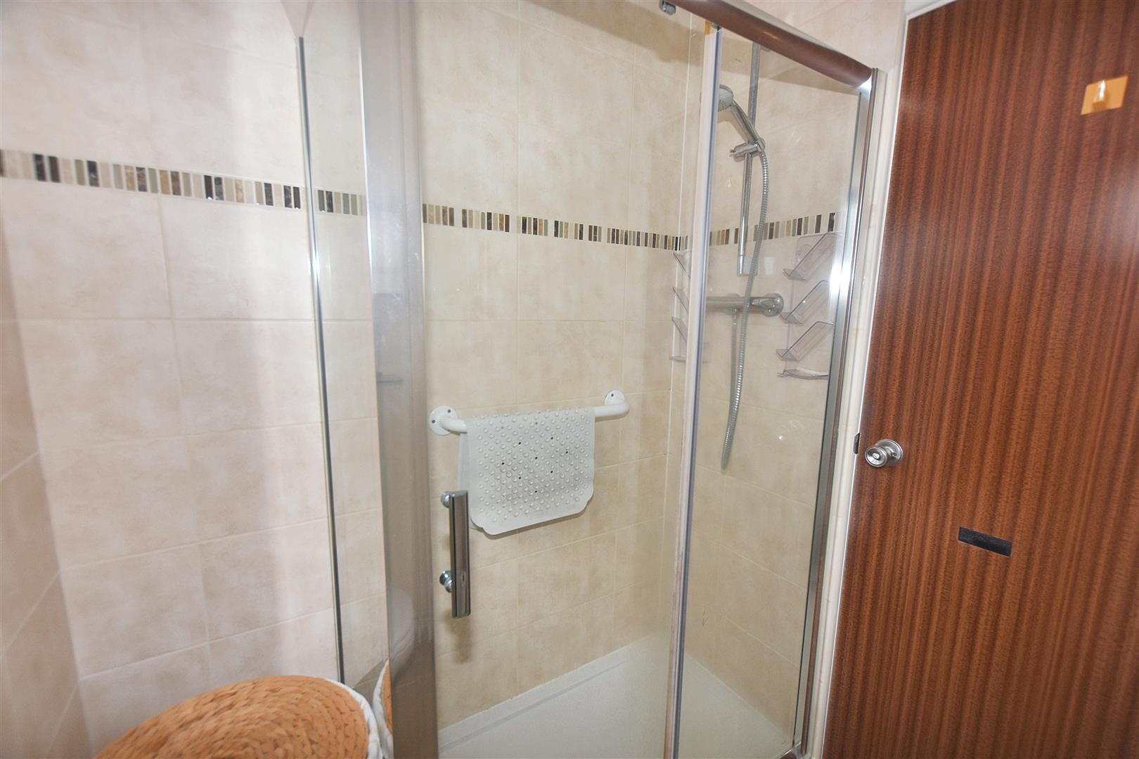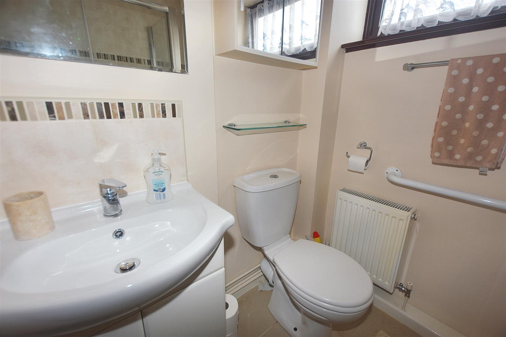 Low level wc with a mirrored medicine cabinet above. Wash hand basin basin built into a vanity unit with tiled splash back, mirror and pull cord light with shaver point above. Shower cubicle with sliding glass doors, thermostatic shower with hand rail and a tiled splash back. Radiator and a high level upvc obscure double glazed window to the side aspect. Extractor fan.