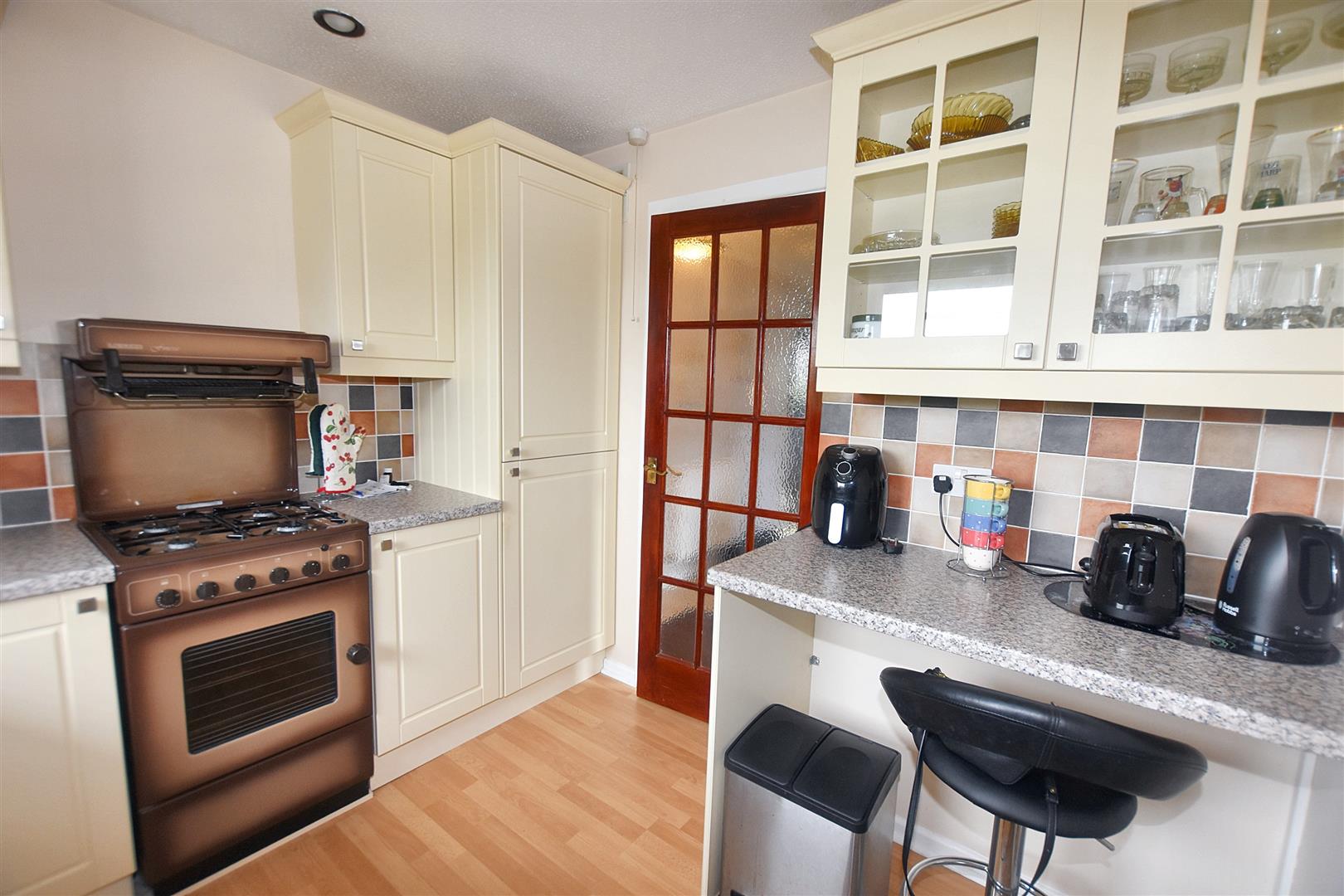 Fitted with a range of eye level and base level storage cupboards and drawers. Breakfast bar with a roll edge work surface and a further roll edge work surface with a tiled splash back. Single stainless steel sink and drainer and a radiator. Upvc double glazed window overlooking the rear garden and aspect with far reaching north westerly views over the countryside. Integrated washing machine, integrated fridge/freezer and space for a gas cooker.